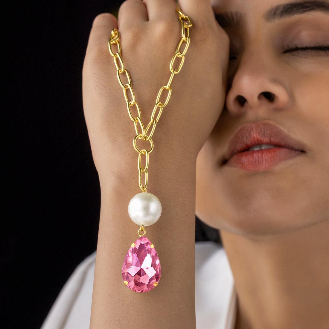 This exquisite Y-necklace, which is elegantly crafted to accentuate your neckline, has a delicate chain that attracts attention with its sophisticated silhouette. A glittering crystal accent and a glowing pearl drop at the center create a classic combination of brilliance and softness. Ideal for both day and evening use, the lariat-style drop provides a touch of drama without sacrificing subtle appeal. It is comfy and lightweight, and it looks great against the skin and goes well with both formal and informal ensembles. This necklace adds a touch of refinement to any ensemble, whether it is worn alone for a simple statement or layered with other items. It's a multipurpose piece that will add flair to your jewelry collection and is perfect for special occasions as well as everyday use.