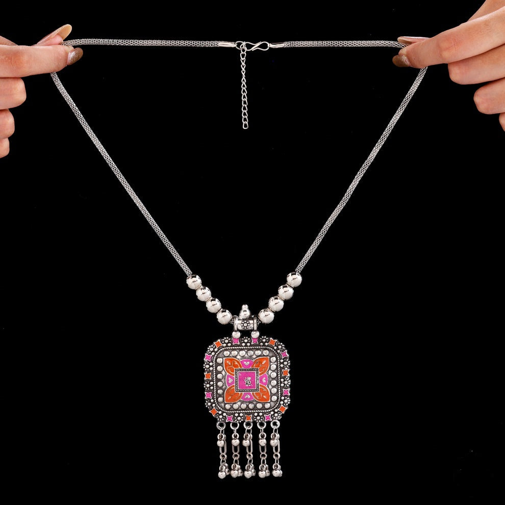The PRANJO Ethnic Square Oversized Pendant Necklace is a striking statement piece that features a large, eye-catching pendant with intricate enamel detailing in vibrant fuschia and orange hues. Crafted from oxidised silver, this necklace exudes a vintage charm while embracing an ethnic aesthetic. The bold design makes it a perfect accessory to elevate any outfit, adding a touch of elegance and cultural flair. This necklace is versatile and can be paired with both traditional and contemporary ensembles. Its unique design and craftsmanship make it a standout addition to any jewelry collection.