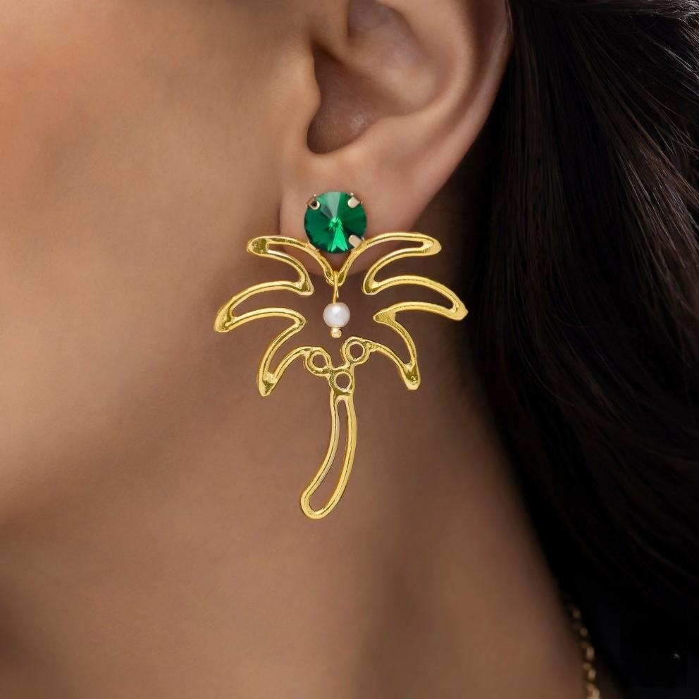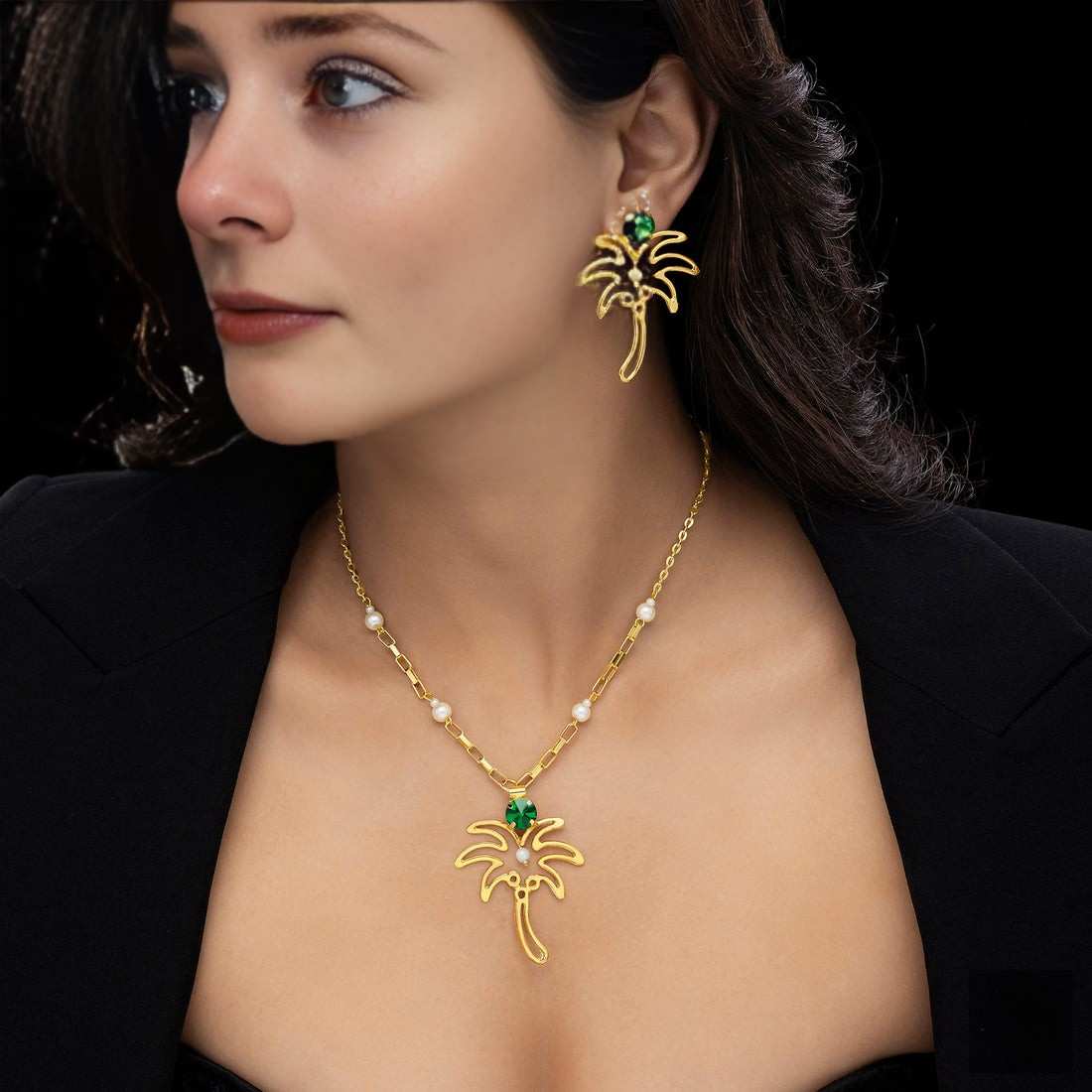 This exquisitely crafted necklace set, which has a delicate palm tree pendant that radiates charm and sophistication, captures the spirit of tropical beauty. A radiant touch to your appearance is added by the exquisitely designed pendant, which features complex workmanship and glittering accents that catch the light delightfully. The necklace hangs elegantly on the neckline from a sleek and fashionable chain, making it appropriate for both formal and informal settings. The pattern is complemented by the matching earrings, which add a coordinated touch of tropical charm to your ensemble. This set gives a distinctive and revitalizing vibe to any ensemble, whether it is worn as a representation of leisure and paradise or just as a fashionable statement.